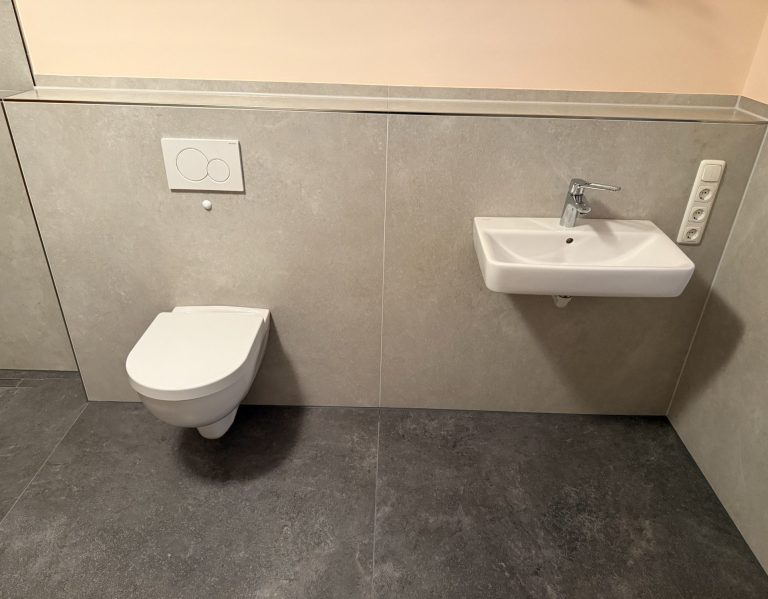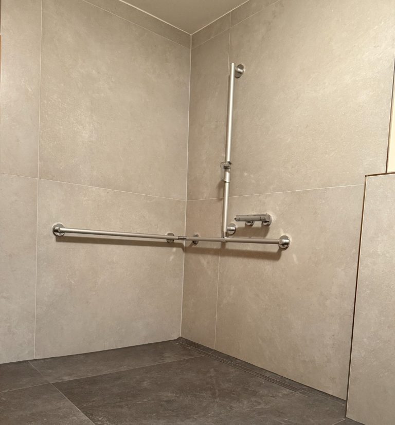 In diesem Bad wurde eine barrierefreie Gestaltung umgesetzt, die es Menschen mit körperlichen Einschränkungen ermöglicht, den Raum problemlos zu nutzen.